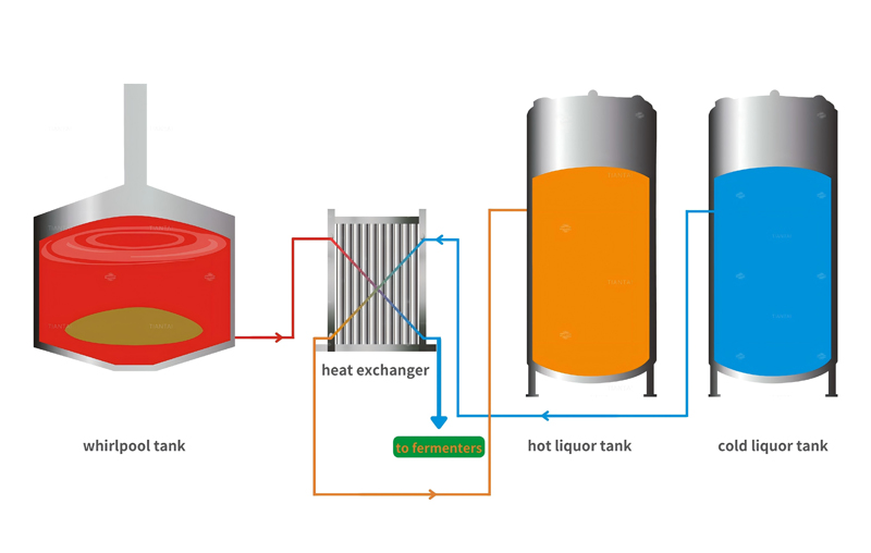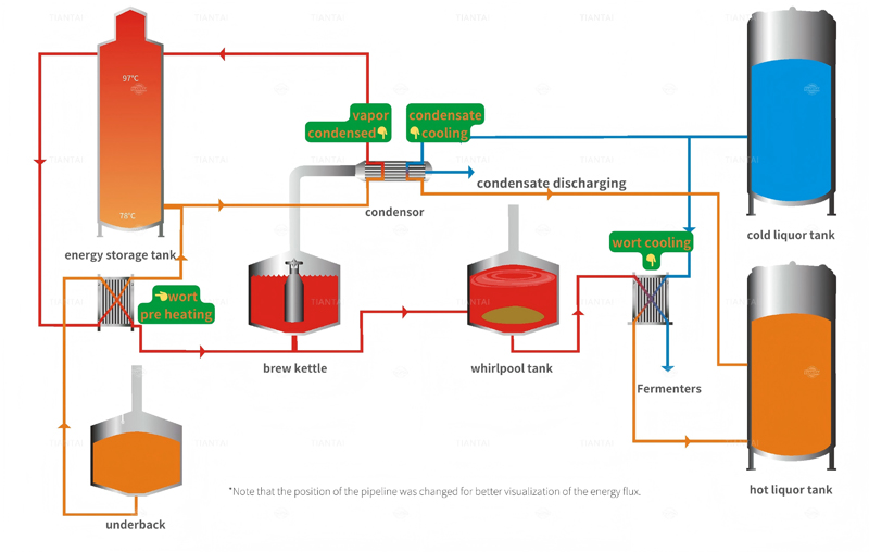 The whole brewery energy recovery system typically consists of a hot liquor tank, cold liquor tank, plate changer, underback, kettle steam condenser and energy storage tank.